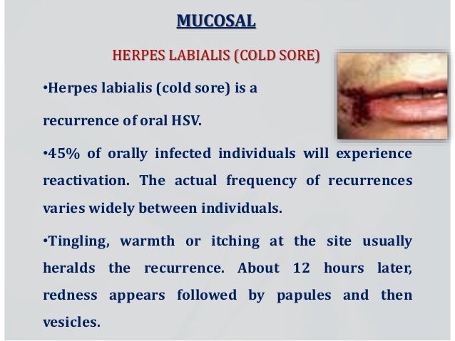 Recurrent infections tend to be milder than primary infections and generally occur in the same location as the primary infection. From there, it tends to recur on the lower lip or face. The patient was treated with oral acyclovir. The eruption was associated with a burning sensation. You'll probably have fewer sores, too, and those you have.